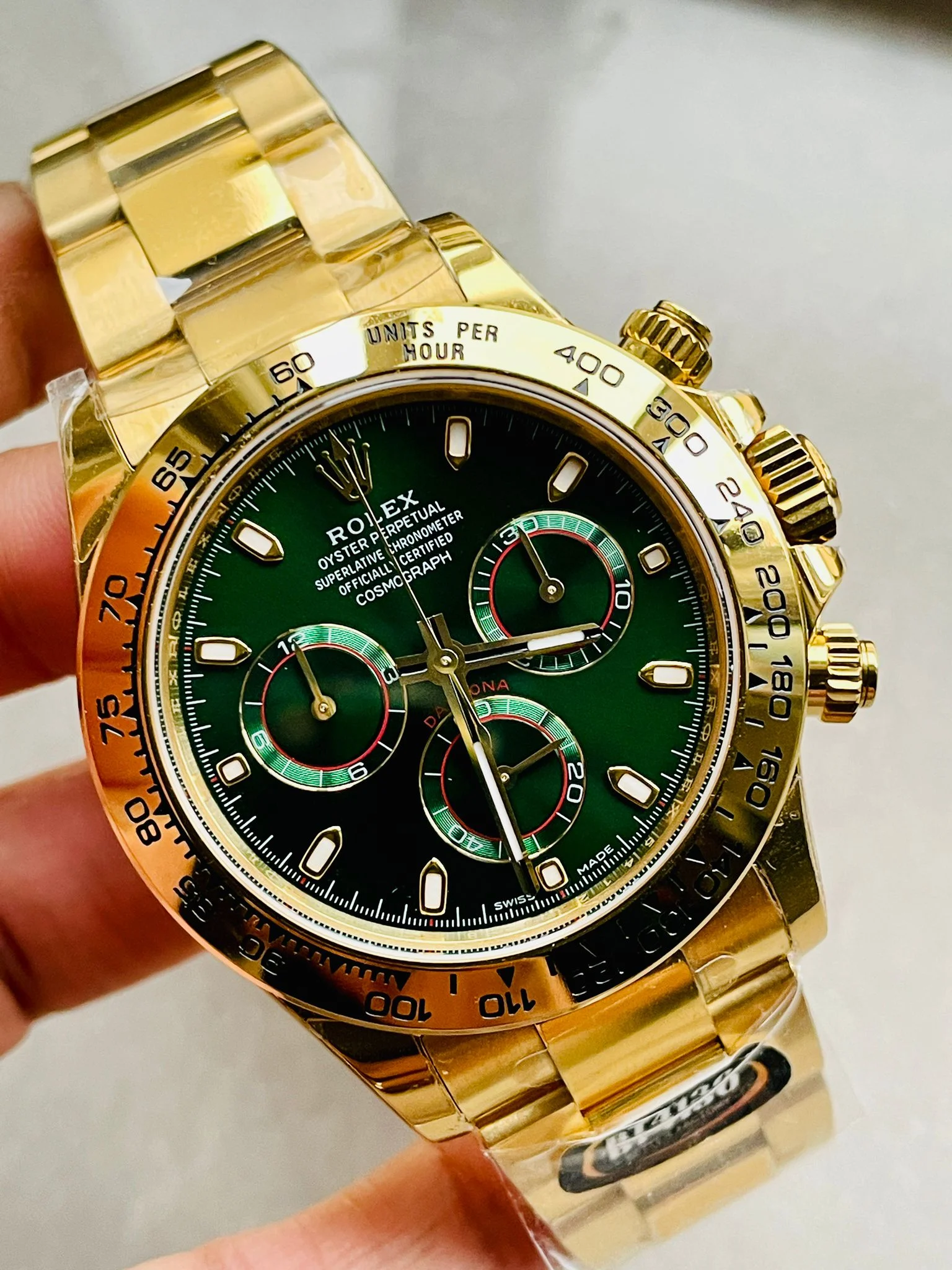 The Daytona 116508 BTF 1:1 Best Edition is a striking statement of luxury and precision. Featuring a vibrant green dial paired with a full 18K yellow gold bracelet, this iconic Daytona combines elegance with high-performance chronograph functionality. Powered by the reliable SA4130 automatic movement, it ensures smooth timekeeping, precise chronograph operation, and authentic weight and feel.